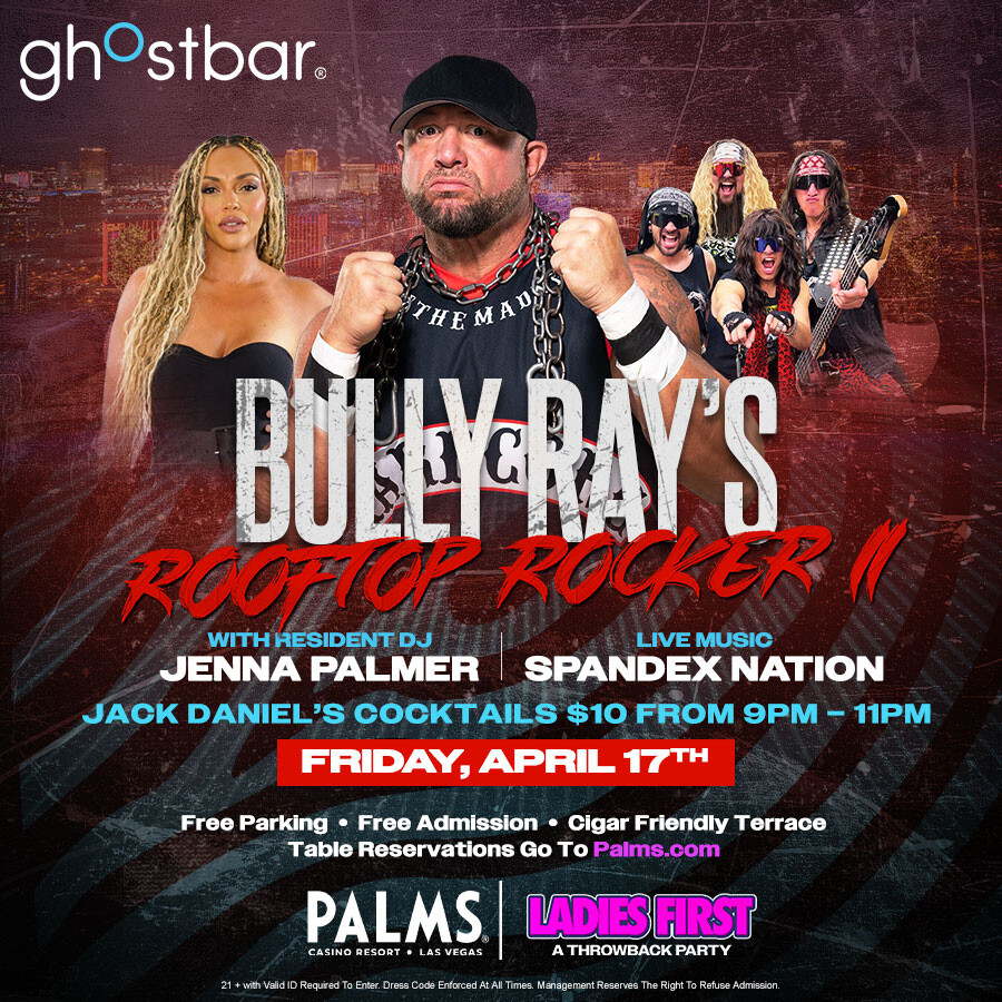 Ghostbar and Palms Casino Resort presents "Bully Ray's Rooftop Rocker II" Fridays. Doors open at 9pm with complimentary admission for everyone. Hosted by WWE Hall of Famer Bully Ray along with Resident DJ Jenna Palmer and Spandex Nation performing live on the rooftop!