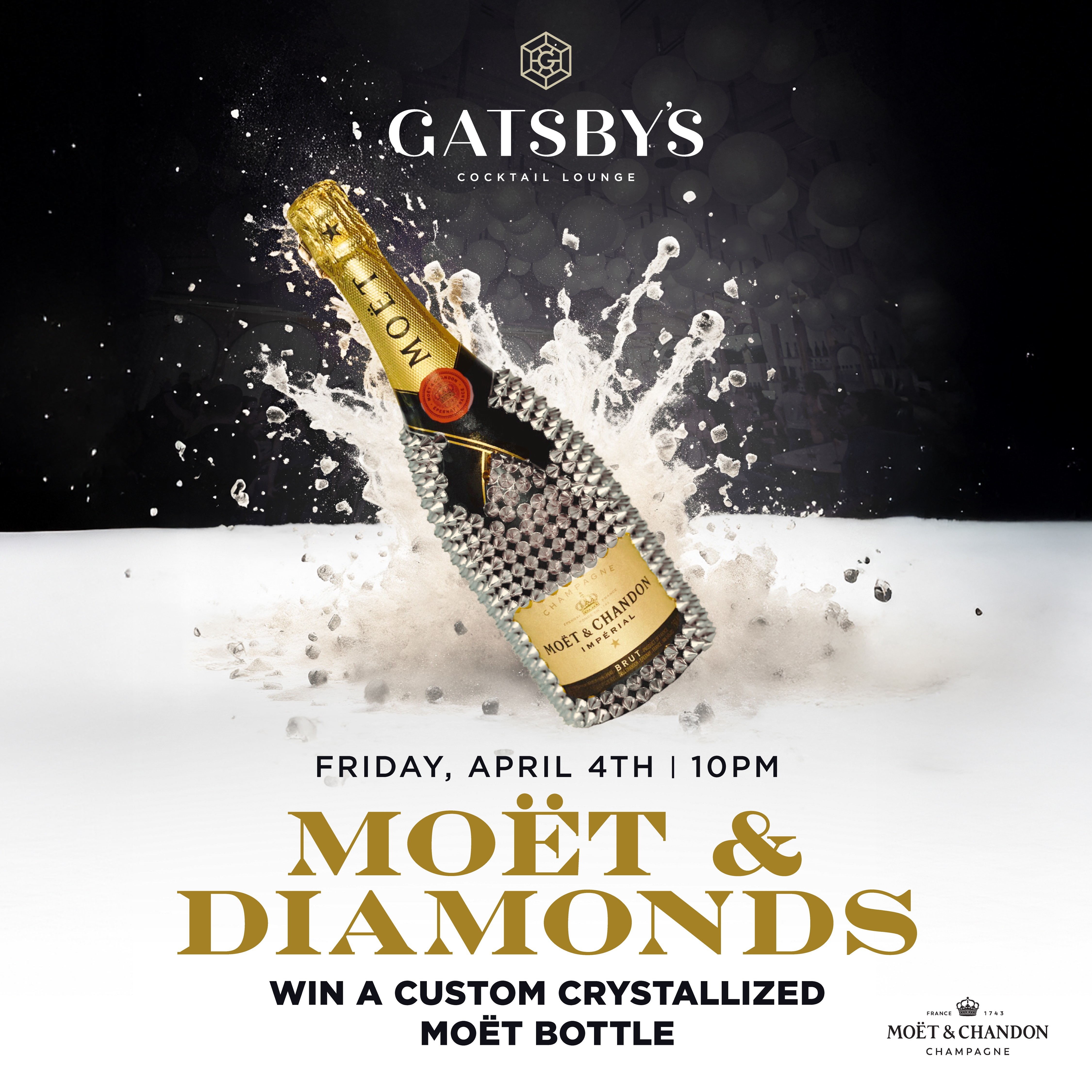Sparkle the night away with Moet & Chandon at Gatsby's! Enjoy champagne, diamond-themed décor, a female DJ, and exclusive experiences like permanent jewelry and crystallized bottles. A Las Vegas nightlife event you won't forget!