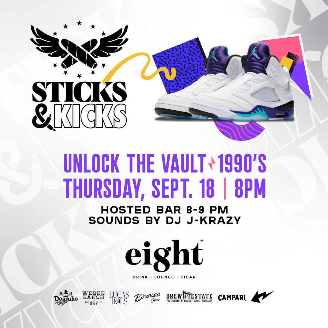 Sticks & Kicks is back September 18th. Grab those 1990's classics and come show out with your favorite pair. J-Krazy on the 1's & 2's + giveaways from Bring it Back LV and more. Eight Lounge's Sticks & Kicks is the place to be and be scene for sneaker heads and cigar aficionados alike. Join us September 18th, complementary cigars and cocktails from 8-9pm.