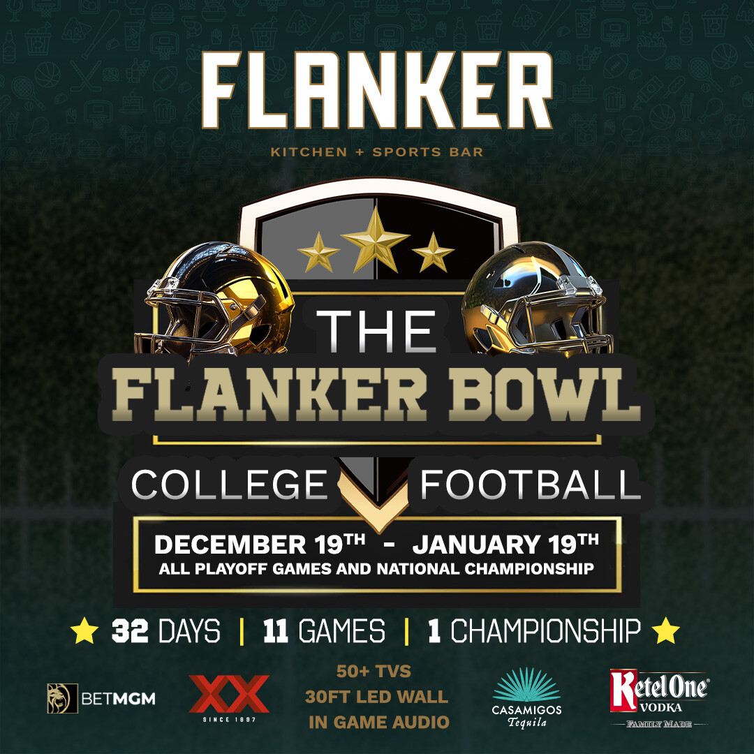 The Flanker Bowl: College Football Playoffs 2025–26 COTTON BOWL - PRESENTED BY GOODYEAR It's time for the ultimate showdown. The Flanker Bowl returns for the College Football Playoffs, where every game day feels like a championship. Catch every snap, touchdown, and highlight on our massive LED screens with full sound, an atmosphere that rivals the stadium itself, and a crowd that knows how to celebrate. Enjoy game-day platters, shareable favorites, wings, sliders, and Flanker's signature cocktails, alongside beer buckets, large-format specials, and VIP table experiences for the biggest matchups of the year. Reservations are strongly encouraged. The stage is set, the teams are ready — and The Flanker Bowl is where the playoffs come to life.