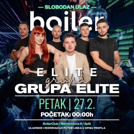 Grupa Elite – Live on Stage! // Datum: 27.02.2025. // Početak: 00:00h // Slobodan Ulaz // Rezervacije stolova: online. Uplaćeni iznos uračunava se u konzumaciju pića. // Vrijeme dolaska za rezervacije: do 00:00h. // Za sve dodatne informacije javite nam se na broj telefona: +385 91 168 0 168 ili putem e-maila: