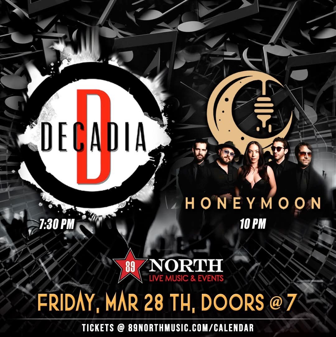 THIS EVENT IS 21 & OVER ADVANCED TICKET SALES CLOSE AT 5PM THE DAY OF THIS EVENT. TICKETS ARE AVAILABLE FOR PURCHASE AT THE DOOR. PRICES SHOWN ARE FOR ADVANCED TICKET SALES ONLY. TICKET PRICES AT THE DOOR WILL BE HIGHER. Decadia is multi-media concert experience performing hits from the '80s, '90s and classic movie soundtracks. Honeymoon is a live entertainment band based in the New York Tristate Area. Honeymoon features active live touring musicians, and our commitment to delivering high-quality live music experiences.