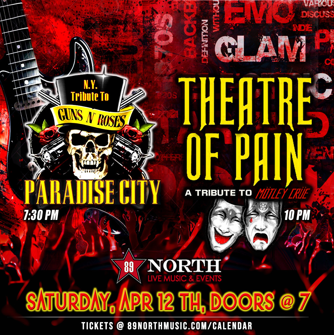THIS EVENT IS 21 & OVER ADVANCED TICKET SALES CLOSE AT 5PM THE DAY OF THIS EVENT. TICKETS ARE AVAILABLE FOR PURCHASE AT THE DOOR. PRICES SHOWN ARE FOR ADVANCED TICKET SALES ONLY. TICKET PRICES AT THE DOOR WILL BE HIGHER. After 5 years, the triumphant return of THEATRE OF PAIN! Incredible deep cuts and hits plus a tribute to Jim Chinnici and Rusty Dacknow With special guests Paradise City - A Guns 'n' Roses tribute