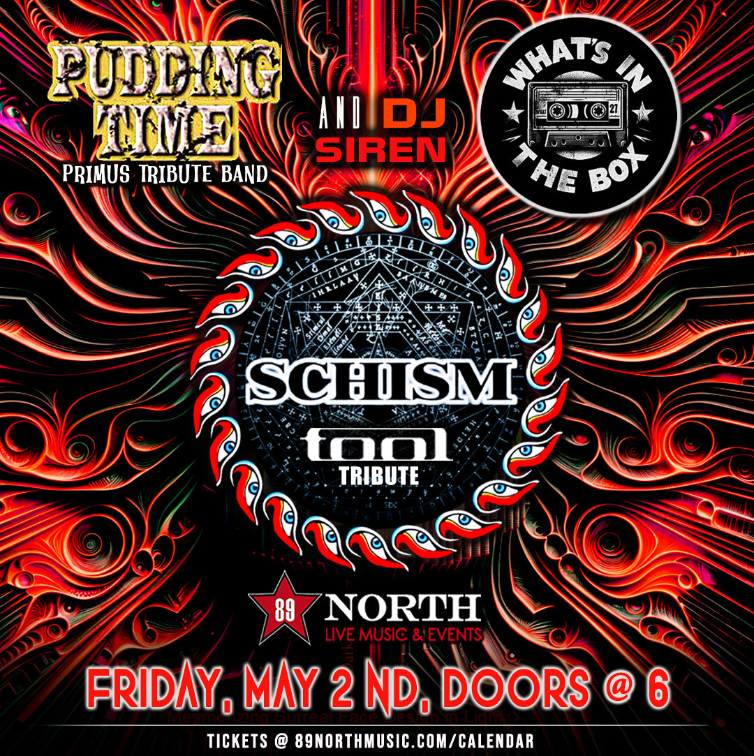 THIS EVENT IS 21 & OVER ADVANCED TICKET SALES CLOSE AT 5PM THE DAY OF THIS EVENT. TICKETS ARE AVAILABLE FOR PURCHASE AT THE DOOR. PRICES SHOWN ARE FOR ADVANCED TICKET SALES ONLY. TICKET PRICES AT THE DOOR WILL BE HIGHER. Schism - The worlds first & longest national touring tribute to TOOL, celebrating 23 years of performing Tool's music. Pudding Time - A tribute to Primus.