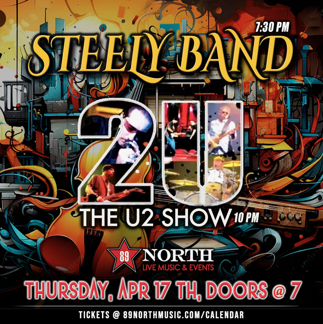 THIS EVENT IS 21 & OVER ADVANCED TICKET SALES CLOSE AT 5PM THE DAY OF THIS EVENT. TICKETS ARE AVAILABLE FOR PURCHASE AT THE DOOR. PRICES SHOWN ARE FOR ADVANCED TICKET SALES ONLY. TICKET PRICES AT THE DOOR WILL BE HIGHER. Steely Band - LI based 5 pc. band of pro's playing Steely Dan chart toppers performed to album quality perfection. Band members were fans long before they realized their ability to emulate SD in a live setting. Flawlessly & effortlessly. 2U - THE WORLDS 2nd BEST U2 SHOW.