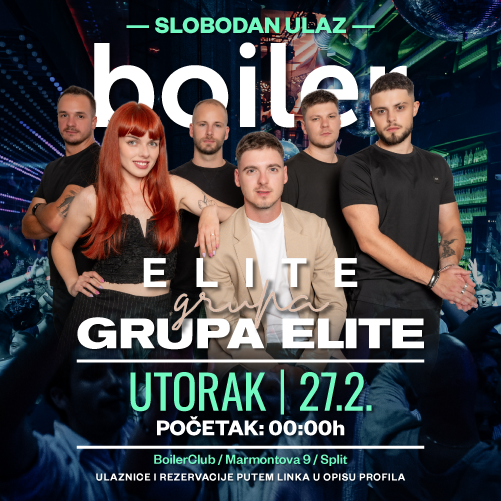 Grupa Elite – Live on Stage! // Datum: 27.02.2025. // Početak: 00:00h // Slobodan Ulaz // Rezervacije stolova: online. Uplaćeni iznos uračunava se u konzumaciju pića. // Vrijeme dolaska za rezervacije: do 00:00h. // Za sve dodatne informacije javite nam se na broj telefona: +385 91 168 0 168 ili putem e-maila: