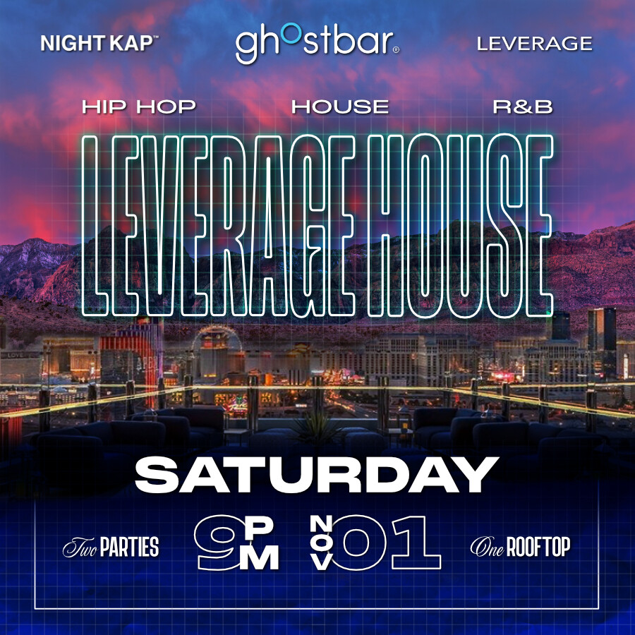 Ghostbar, Leverage, and Night Kap presents "Leverage House." Twp parties, one rooftop #55floorsup. The best in Hip-Hop, House, and R&B. Doors open at 9pm. Two rooms, two sounds systems. Cigar friendly patio. Must be 21 with proper ID. Entertainment subject to change.