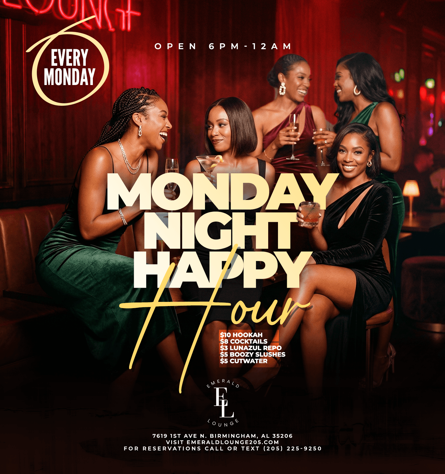Monday Night Happy Hour at Emerald Lounge is designed for a smooth, elevated start to your week. From 6PM to midnight, the atmosphere is relaxed yet stylish—perfect for unwinding after work, casual meetups, or lowkey celebrations.