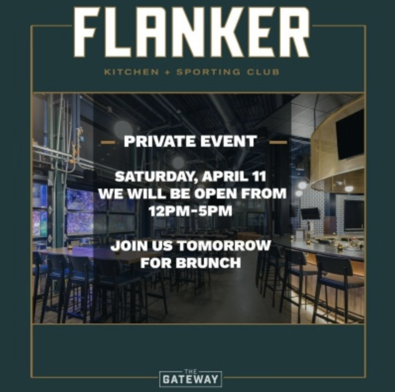Flanker Kitchen & Sporting Club will be open on Saturday, April 11, from 12:00 PM to 5:00 PM.