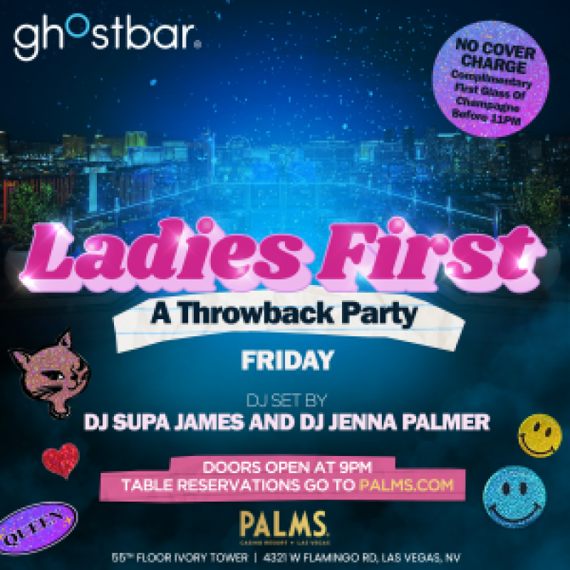 Ghostbar and the Palms Hotel and Casino Resort presents "Ladies First" Fridays. Doors open at 9pm with complimentary admission for everyone and all ladies will receive their first glass of champagne FREE before 11pm. Resident DJ Jenna Palmer will be joined by Ghostbar Resident DJ Supa James playing all the hits of the 80's, 90's, and early 2000's. Must be 21 and over with proper I.D. Entertainment Subject to change Management Reserves All Rights