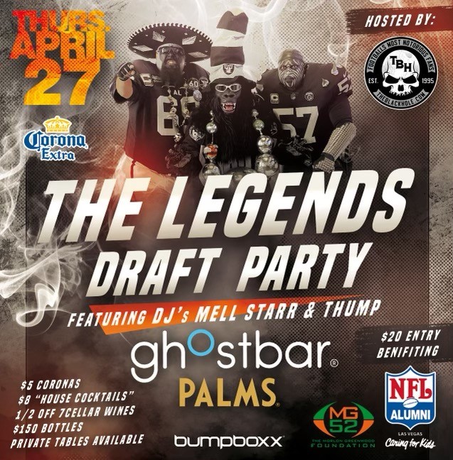 Ghostbar and The NFL Alumni Association, and The Black Hole presents "The Legends Draft Party" featuring DJ's Mel Starr and Thump. Doors open at 430pm for this special event. Come and experience the NFL Draft 55 Floors above the Las Vegas skyline. There will be $5 Corona features, $8 "House Cocktails" and $150 bottle features.
