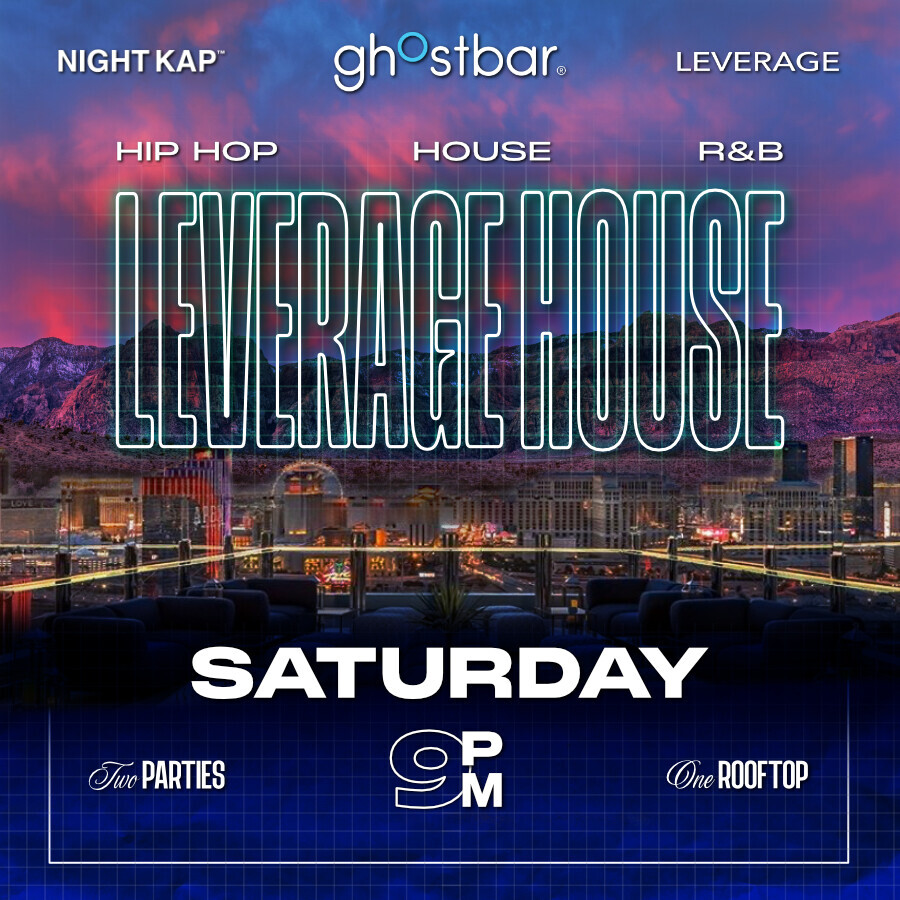 Ghostbar, Leverage, and Night Kap presents "Leverage House." Twp parties, one rooftop #55floorsup. The best in Hip-Hop, House, and R&B. Doors open at 9pm. Two rooms, two sounds systems. Cigar friendly patio. Must be 21 with proper ID. Entertainment subject to change.