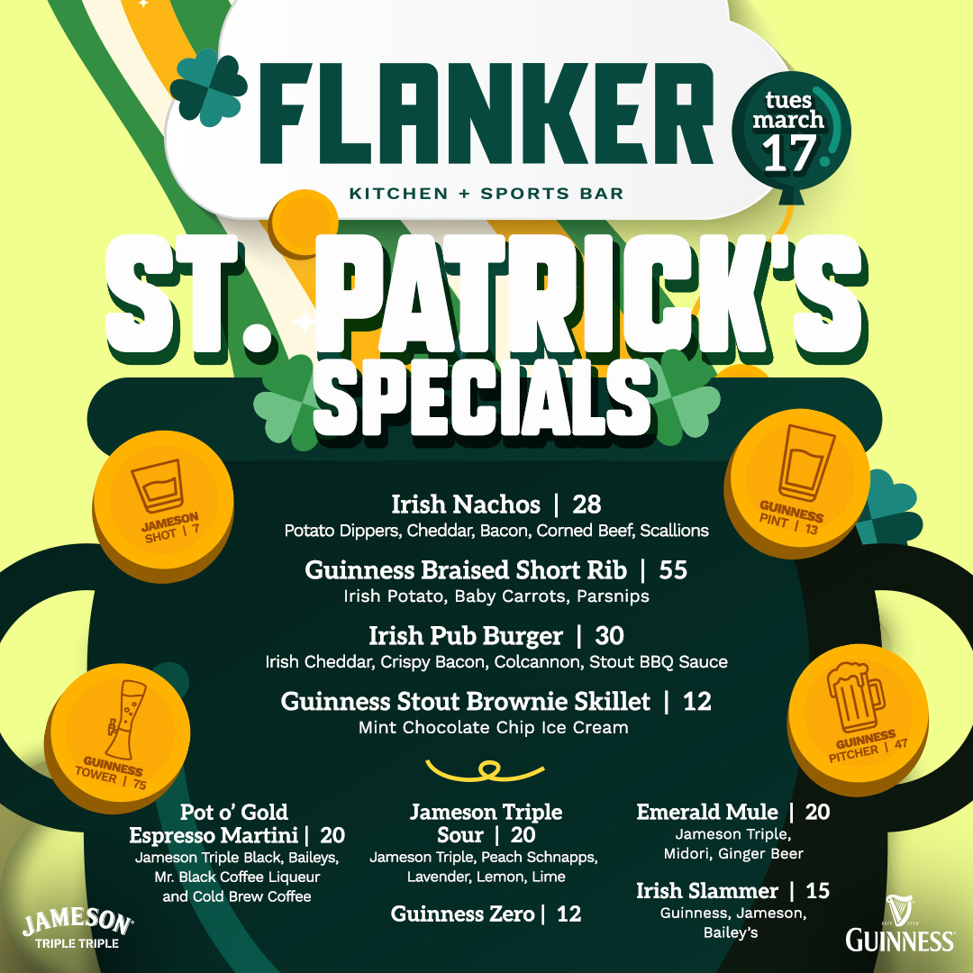 Get lucky this St. Patrick's Day at Flanker Kitchen + Sports Bar.