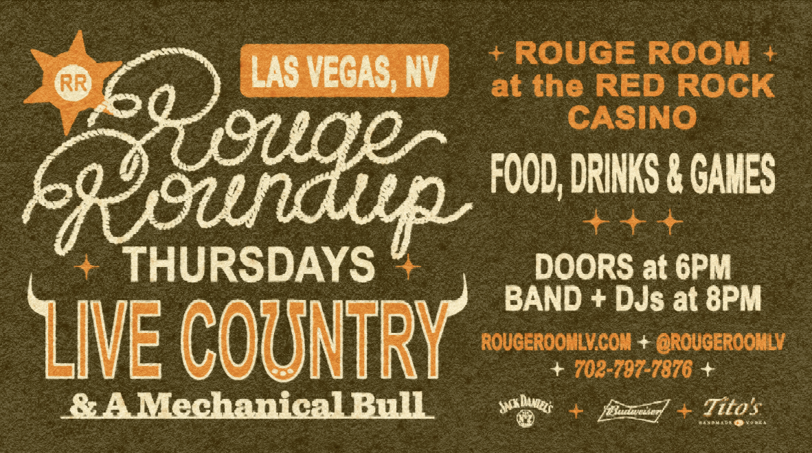 Country music has a new home in Summerlin. Giddy up and get on down to Rouge Room inside Red Rock Casino every Thursday for the one and only, Rouge Roundup! Join us weekly starting at 6pm featuring live performances from Las Vegas' finest local country artists & DJs, a mechanical bull, an outdoor beer garden sponsored by Budweiser, a custom country-inspired food & cocktail menu in partnership with Jack Daniels & Titos Vodka, not to mention half off tables for ladies, a $35 open bar 7-9pm, and so much more. Reserve your place today: rougeroomlv.com