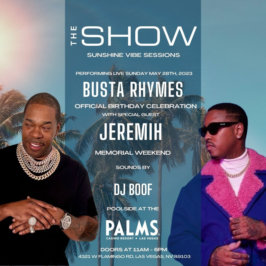 Join us for a special event like no other Poolside at the Palms Casino and Resort in Las Vegas. Sunday May 28th as we present THE SHOW, Day Party Sessions featuring Busta Rhymes and Jeremih. A day party like no other with big DJ's a big Party and legendary live performances by the biggest artists in music.