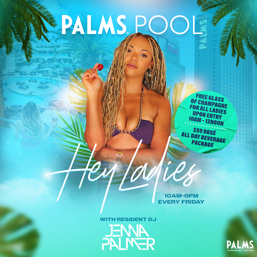 Palms Pool, is proud to present "Ladies First!" This is a day for the ladies to skip work, get a tan, and let loose a little. Enjoy a Rose All Day Package featuring Campo Veijo Sparkling Rose, The Pink Senorita cocktail featuring Codigo Rose Tequila, and Sainte Marguerite Still Rose Wine. There will also be bottle features on GH Mumm Rose Champagne, Absolut Vodka, and Malibu Rum for the ladies. All Ladies will receive a complimentary glass of bubbles between 10am - 12noon. Resident DJ Jenna Palmer will be providing the day's soundtrack from 12 noon - 6pm. Entertainment and Features subject to change
