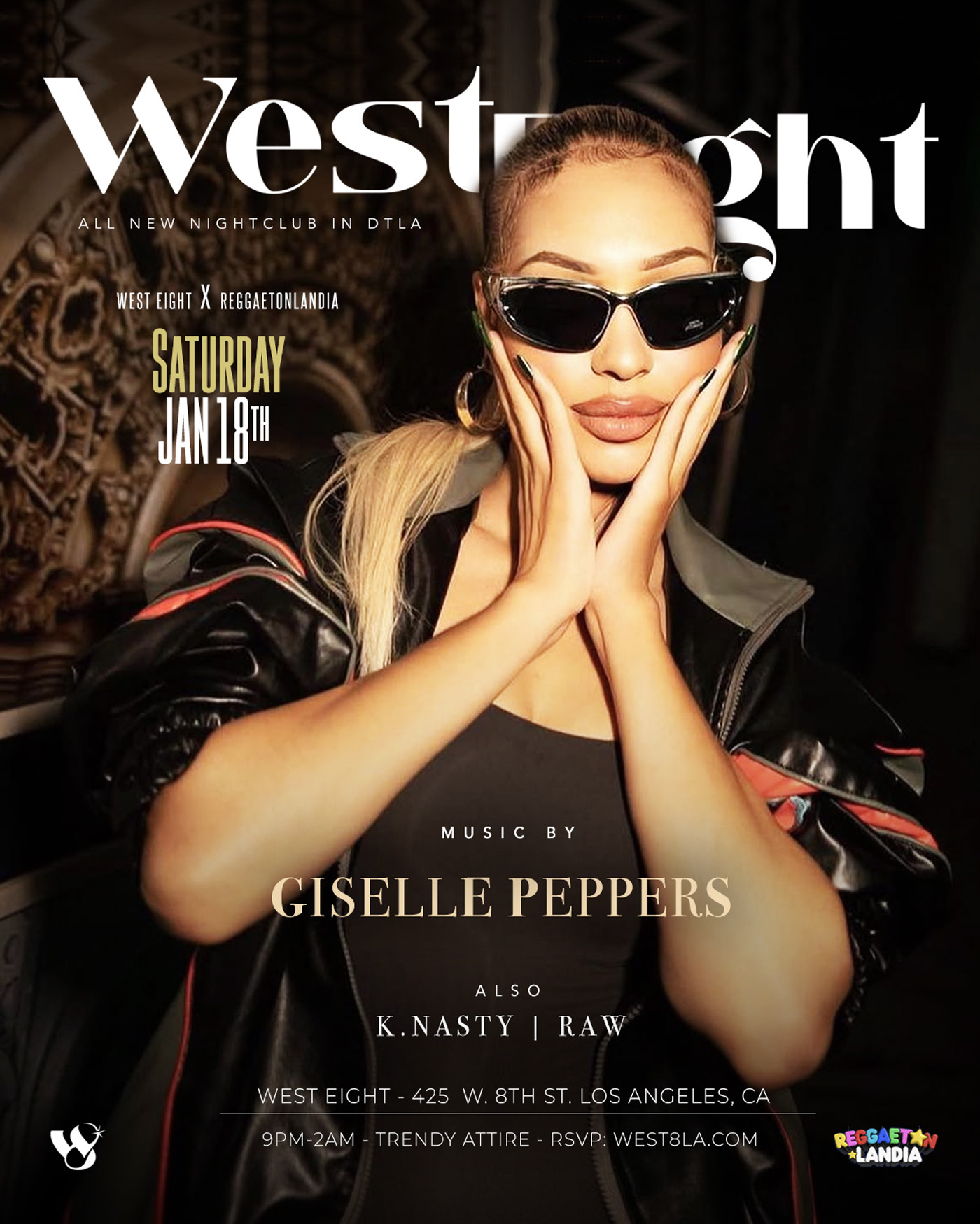 Bringing the vibes to West Eight is the best Reggaeton party in the country, Reggaetonlandia. One event you do not want to miss! Guest DJs: Giselle Peppers, K. Nasty, RAW - Free guestlist before 11pm. Bottle Special: 2x bottles + entrance for $550 w/ rsvp before 10:30pm (+gratuity and tax). More info: Text "West Eight" to 323-205-8384